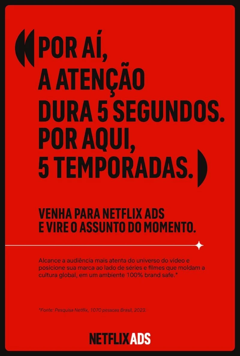 For the SXSW debut of Netflix Ads, we crafted a bold and witty campaign that showcased the platform’s unique ability to connect brands with culture-defining content. Using irreverent and attention-grabbing headlines, we highlighted how Netflix Ads doesn’t just reach audiences - it captures them. By blending Netflix’s signature tone with powerful “reasons to believe,” the campaign positioned the platform as the place where brands don’t interrupt stories, they become part of them. The campaign was featured in Meio & Mensagem, one of Brazil’s leading advertising and media publications.